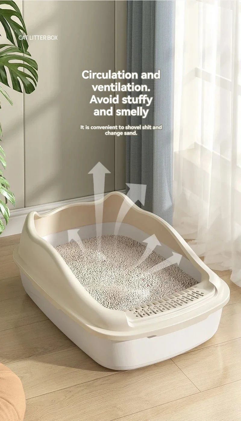 2.Open Design: Promote air circulation and easily monitor your cat's movements. This high sided litter box has an open top that allows air to flow in and out, reducing odor and keeping your cat comfortable. You can also keep an eye on your cat's health and behavior by observing how they use the litter box.